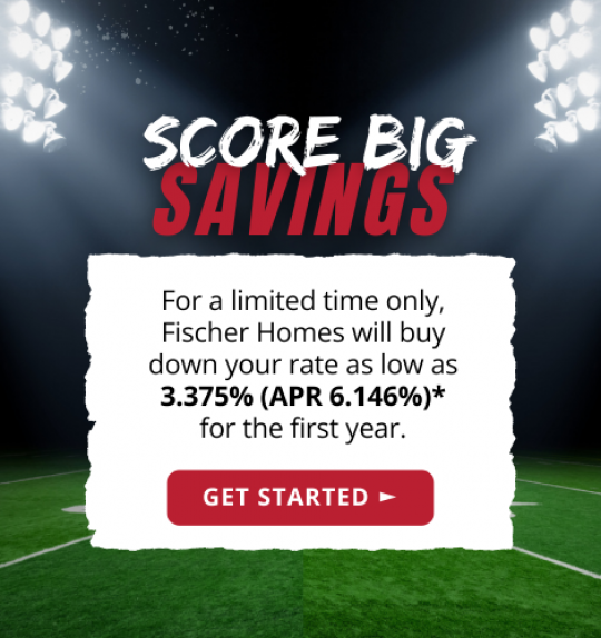 *Interest rate applies to an FHA 30-year fixed rate mortgage with a 2/1 buydown. The interest rate is temporarily reduced to 3.500 % for year 1, 4.500 % for year 2, and 5.500% for years 3-30. The Annual Percentage Rate (APR) is 6.273%. The highest monthly principal, interest and mortgage insurance payment is $2,526.08 based on a loan amount of $412,382 and interest rate of 5.500%. Rate is indicative as of 08/12/2025 and is subject to change. Rate is based on a minimum down payment of 3.5% and 680 credit score. Interest rate available on select new home in select new home communities only. Complimentary refinance offered on behalf of Victory Mortgage and valid for three years after date of Fischer Home closing. All loans subject to approval. Financing offered by Victory Mortgage, LLC. NMLS 461249. Equal Housing Lender.